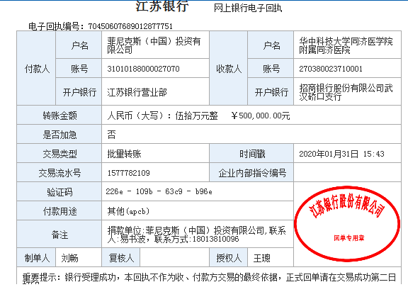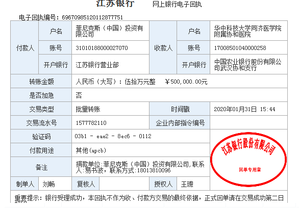 1月30日,定向捐赠100万元给武汉华科同济医院和协和医院,用于当地医院购买防疫物资。