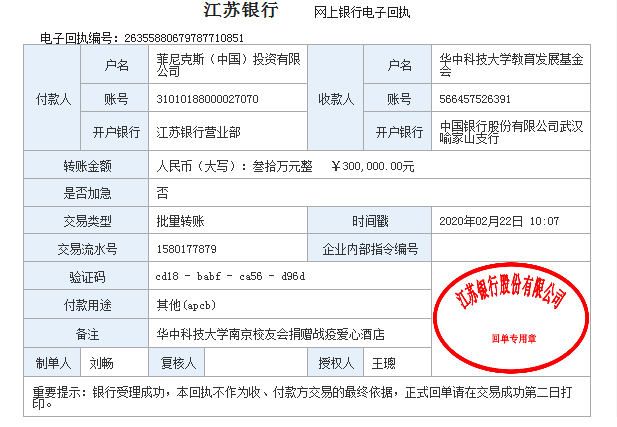 2月21日,定向捐赠30万元给武汉华中科技大学,支持“战疫爱心酒店”项目,用于为医生租用医院附近酒店,为医护人员提供就近食宿及交通服务,缓解他们的劳顿!