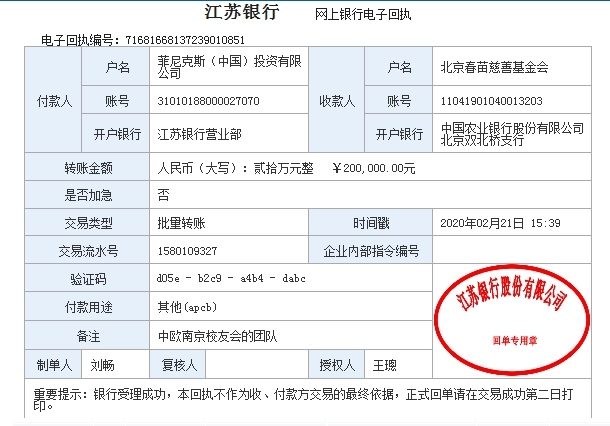 2月21日,向“同舟共济 大爱无疆南京逆行者支援令”项目捐赠20万元,致敬南京援鄂抗疫的医护人员(5000元/人)。