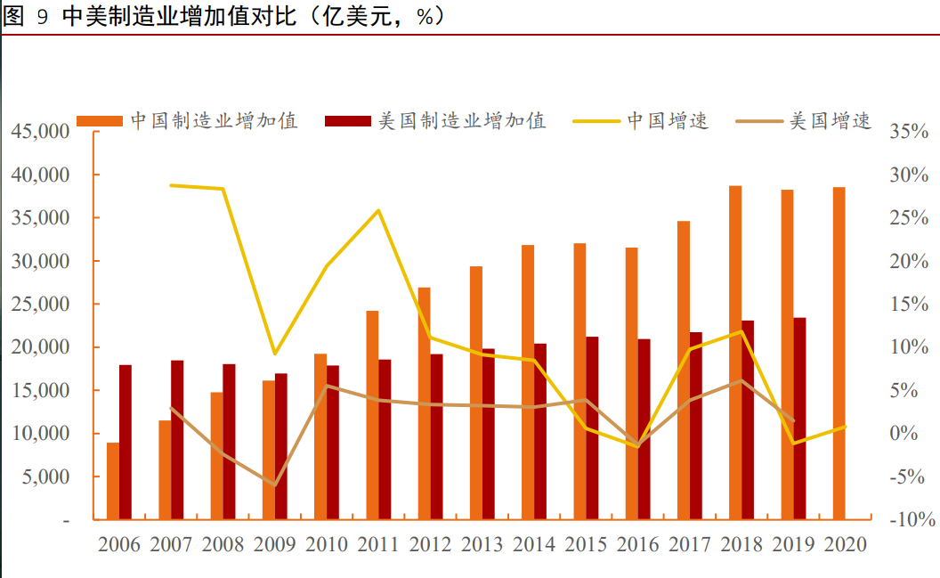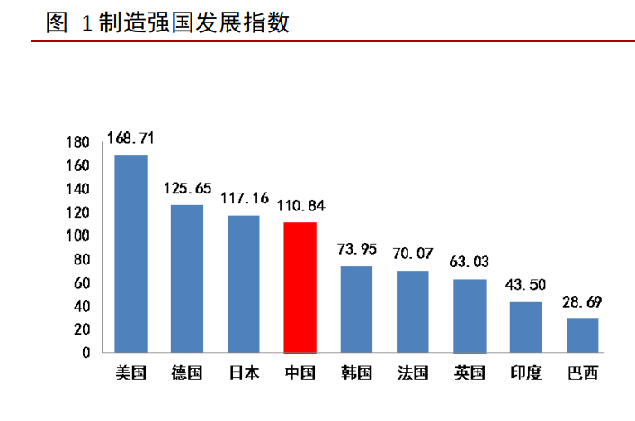 我国制造业效率相对低下,智能制造助力中国制造产业升级。制造强国发展指数由规模发展、质量效益、结构优化、持续发展 共四个分项数值构成,我国总分 110.84,居于世界第四,处于第三阵列国家。从分项来 看,我国规模发展分数项第一,早在 2010 年我国制造业增加值已超越美国,而质量效 益分数项得分 16.11,居于世界第七,远低于世界第一美国 51.96,从上述报告评分结果 看,提高我国制造业效率及发展质量是建设制造业强国的必经之路,而智能制造将持续 助力中国制造业产业升级。