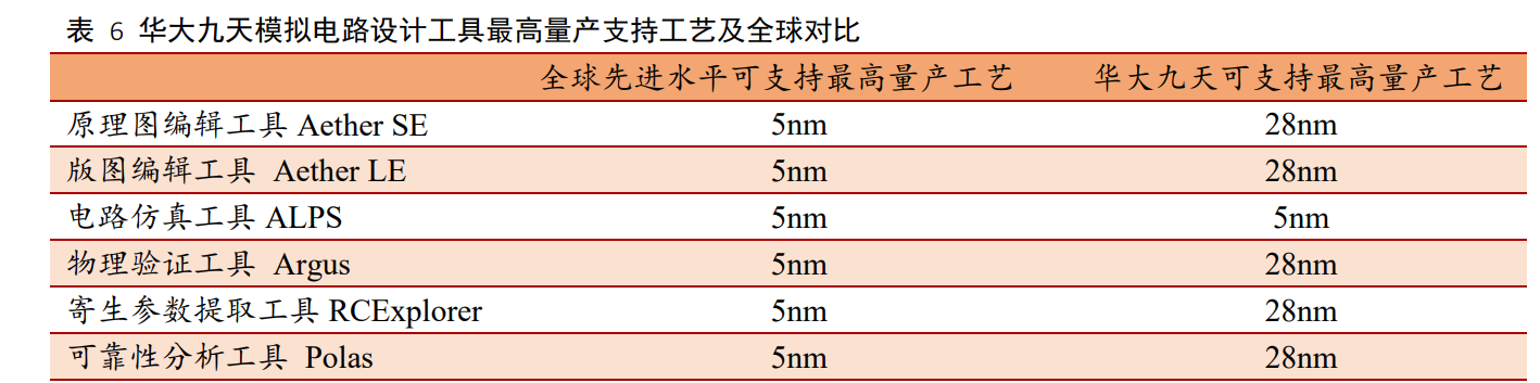 公司为国内唯一一家提供模拟电路 EDA 全流程工具的企业,其主要客户为从事模 拟芯片设计和大规模系统级芯片设计的企业,主要用于模拟电路模块的设计和验证。模 拟芯片具有生命周期长、对先进工艺制程依赖低的特点,更关注性能指标、可靠性和成 本,因此通常采用更稳定的成熟工艺制程。目前大部分模拟芯片产品仍在使用 28nm 及 以上的成熟工艺制程。公司目前模拟电路设计全流程 EDA 工具系统中,电路仿真工具 支持最先进的 5nm 量产工艺制程,处于国际领先水平;其他模拟电路设计 EDA 工具支持28nm 工艺制程,与已支持 5nm 先进工艺的同类领先工具相比仍存在一定差距。