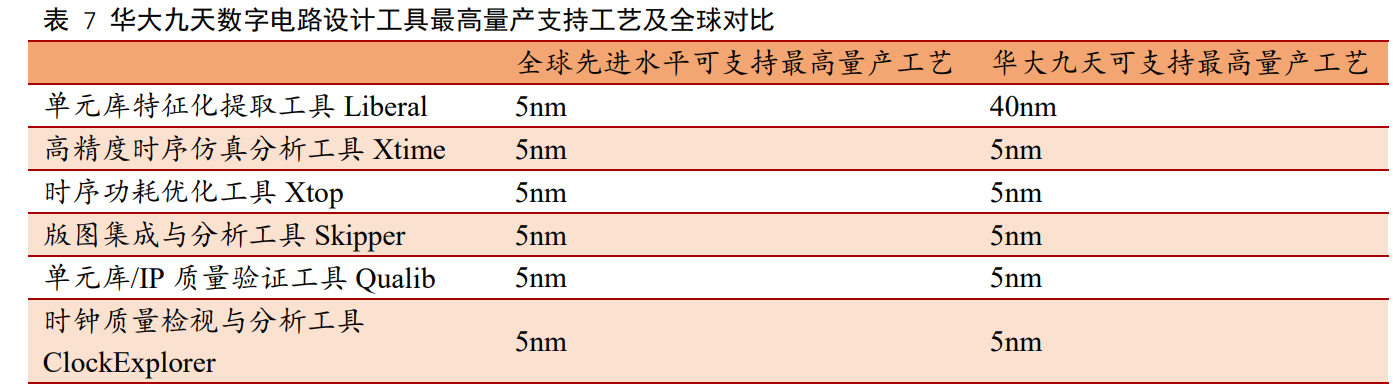 数字电路设计是指电路功能设计、逻辑综合、物理实现以及电路和版图分析验证 的过程。这一过程通常分为数字前端和数字后端两部分,数字前端设计流程从设计架构 开始,用硬件语言对芯片功能进行描述编码;通过仿真工具进行逻辑仿真,检验设计代 码的正确性;然后通过逻辑综合将设计代码映射到电路结构,输出描述数字电路结构的 电路网表文件。数字后端设计流程负责将前端设计生成的电路网表实现为可生产的物理 版图。通过布局布线工具将电路网表中使用到的各种单元和 IP 在版图上进行合理摆放、 连接,形成布局布线后的电路网表和版图;对布局布线后的版图进行寄生参数提取,再 进行时序分析和优化、物理验证等工作,确认设计不存在功能和物理规则上的问题;最 后进行版图集成,形成最终交付晶圆代工厂生产的版图。但公司目前在数字电路 EDA 领域仅覆盖数字电路设计的部分流程。整体来看,公司已发布的数字电路设计 EDA 工 具中,除个别工具外均达到国际领先水平,可支持 5nm 量产工艺制程。