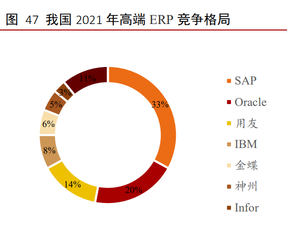 根据前瞻产业研究院数据,2018 年我国 ERP 市场规模达 265 亿元,国内厂商占据 市场份额 70%,代表厂商为用友、浪潮和金蝶等,但国内 ERP 厂商的产品主要占据中 小企业市场,大型企业的高端 ERP 软件市场仍被 SAP、Oracle 等国外厂商占据主要份 额,二者合计占比国内高端市场份额的 60%以上。国产 ERP 厂商起步相对较晚,ERP 软件的技术水平、产品能力和产业规模均与我国制造大国地位不相匹配,当前跨国企业、 集团型央企和大型企业超过半数以上仍使用国外 ERP 产品,此外即使在国产化需求较 高的军工领域,国产厂商浪潮和用友均有相应的 ERP 解决方案与应用案例,但当前大 部分军工厂商核心业务模块(如供应链和生产管理)仍使用 SAP 的产品。未来,随着国 产高端 ERP 产品的性能不断提升,高端 ERP 市场国产替代不断推进,国产 ERP 发展空 间有望进一步打开。