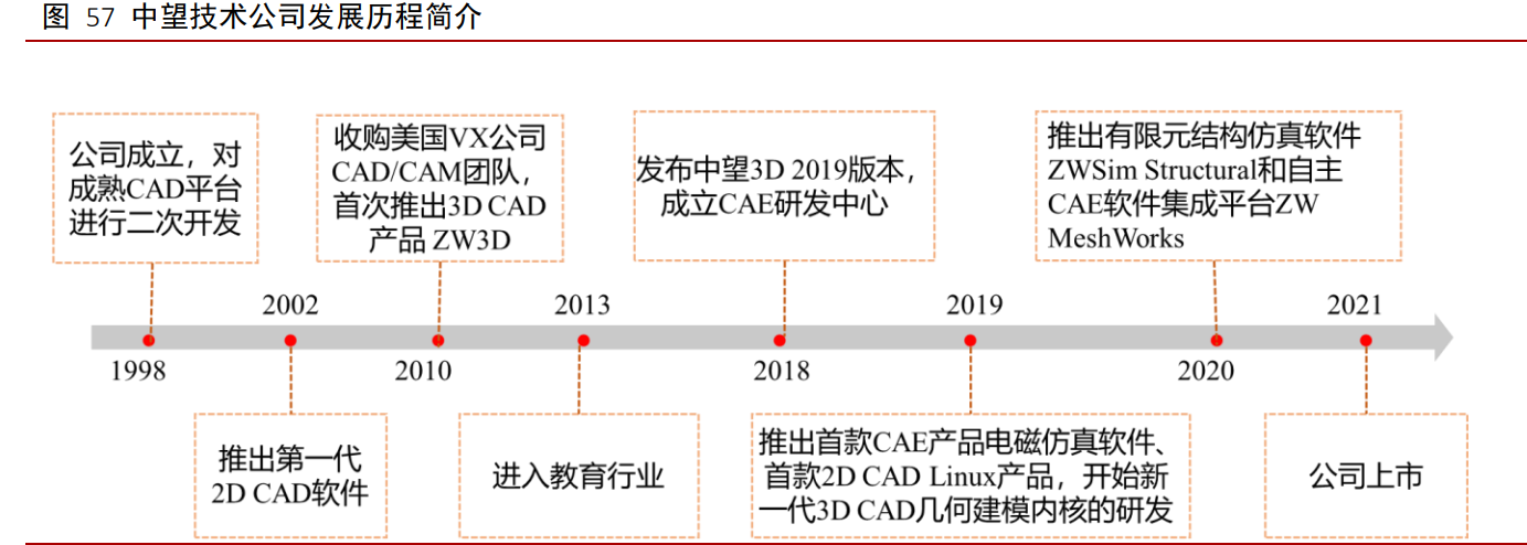 中望软件为国内领先的 CAX 软件龙头厂商,是国内唯一一家拥有独立开发 CAD/CAE 能力的公司,并推出了首款 3D CAD 平台产品;2019 年公司推出首款 CAE 产品, 2020 年发布了 CAE 软件集成平台和 CAE 软件 Zwsim Strutural,致力于推出一 体化 CAX 平台,向国际巨头靠拢。