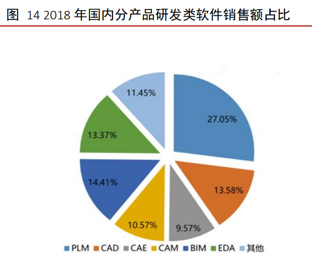 根据赛迪顾问数据,2018 年我国研发类软件市场规模 142.7 亿元,从产品分布来 看,PLM 目前规模最大,其他占比较高的软件有 CAD/CAE/CAM/EDA/BIM 等。