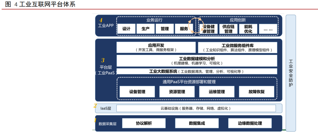 工业互联网是信息技术与制造技术交互的连接点,发展工业互联网是实现智能制 造的路径之一。所谓工业互联网,本质是一个工业操作系统,其功能类似于微软的 Windows、谷歌的安卓系统以及苹果的 iOS 系统,向上提供开发接口及存储计算、工具 资源等支持,向下实现对各种软硬件资源的接入、控制和管理。工业互联网平台由边缘 层、IaaS 层、PaaS 层及应用层构成。边缘层是基础,向下接入工业设备实现数据的采集 与处理。工业 PaaS 层是核心,基于通用 PaaS 并融合多种创新功能,将工业机理沉淀为 模型,实现数据的深度分析并为 SaaS 层提供开发环境,是平台核心能力的集中体现。 应用层是关键,主要提供覆盖不同行业,不同领域的业务应用及创新性应用,形成工业 互联网平台的最终价值。