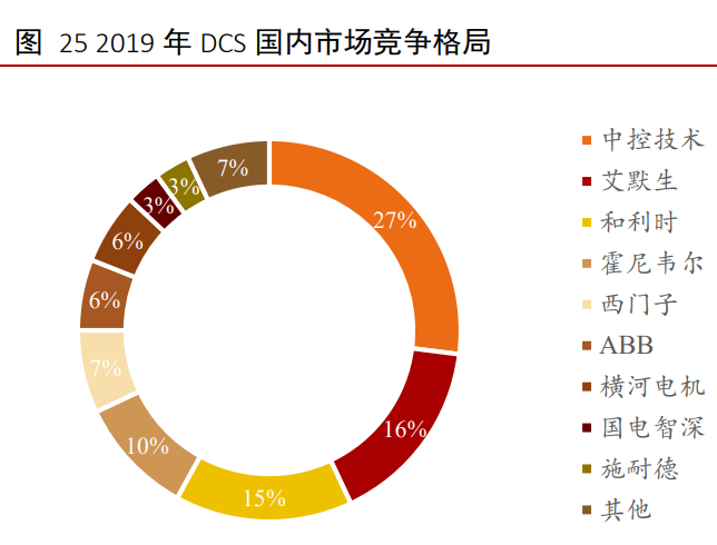 2018 年全球 DCS 的整体市场规模约为 65 亿美元,中国 2018 年 DCS 市场规模 约为 82 亿人民币元,比 2017 年增长约 16%。根据华经情报网预测未来 2 年我 国 DCS 市场增速稳定约 4-6%,2019 年主要受到贸易战阴霾经济环境下行影响,DCS 市 场受项目型市场驱动力下降(尤其电力、建材项目减少)而增速下滑,2020 年受疫情和 石油价格暴跌影响,DCS 市场规模短期下降幅度较大。我国 DCS 产品国产化率较高, 达 50%以上,市占率第一为中控技术,占比 27%,此外市占率较高的国产厂商有和利时、 横河电机、国电智深等。