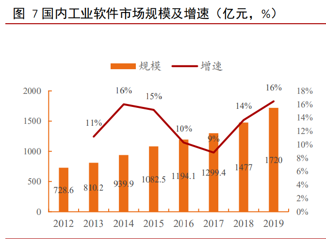 2020 年工业软件全球销售额 4338 亿美元,同比增长 6%;我国 2020 年工业软件 市场规模 1974 亿元,同比增长 11.2%,近两年复合增长率 15.6%,远高于世界平均增速 6%。我国 2020 年工业软件市场规模占全球比例 6.6%,按照我国制造业增加值在全球占 28%以上的份额来估算,我国工业软件市场还存在约 5 倍的增长空间。