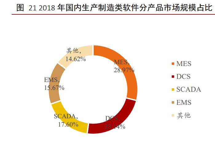 2018 年我国生产制造类软件市场规模 285.6 亿 元 , 从 产 品 分 类 来 看 , MES/DCS/SCADA/EMS 为主要类型;国产软件市占率可达 50%,拥有国产化基础,其 中国电南瑞主要应用电力能源行业,宝信软件、石化盈科、中控技术等主要应用于钢铁 石化行业。