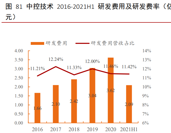 公司盈利能力稳定。 (1) 公 司 2018-2021H1 年 公 司 整 体 毛 利 率 分 别 为 46.7%/48.1%/45.6%/40.32%,2020/2021H1 年公司毛利率下降,可能是由于打入大客户阶 段性价格有所下滑,系推进市场所致(2)公司费用率基本维持稳定。2020 年销售/管理 /财务费用率分别为 15.3%/8.8%/0.37%,相比 2019 年下降 2%,公司费控能力较高。公司不断加大研发,2016 至今研发费用支出不断增加,研发费率保持稳定,2018- 2021H1 研发费率为 12.24%/11.33%/12%/11.46%,公司研发支出基本跟随公司营收规模 增长的节奏。2019-2021H1 研发人员占比分别为 30.39%、33.84%、30.65%,研发人员数 量不断增加。
