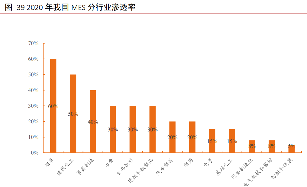 国内 MES 产品渗透率低,未来有望迎来高速成长。根据大东时代智库数据,截止 2021 年 5 月底我国 MES 产品整体渗透率偏低,其中离散制造业渗透率普遍低于 10%, 流程制造行业渗透率则相对较高。如属于流程制造业的烟草行业 MES 渗透率最高可达 到 60%,能源化工行业渗透率可达到 50%,主要因为相关行业具有垄断性,行业利润率 高,且主导者普遍为国企,对于新技术高成本投入不敏感。而如属于离散制造业的纺织服装行业 MES 产品渗透率普遍低于 10%,主要因为相关产业普遍小规模生产、利润率 较低,很难支撑大规模的技术投入成本。
