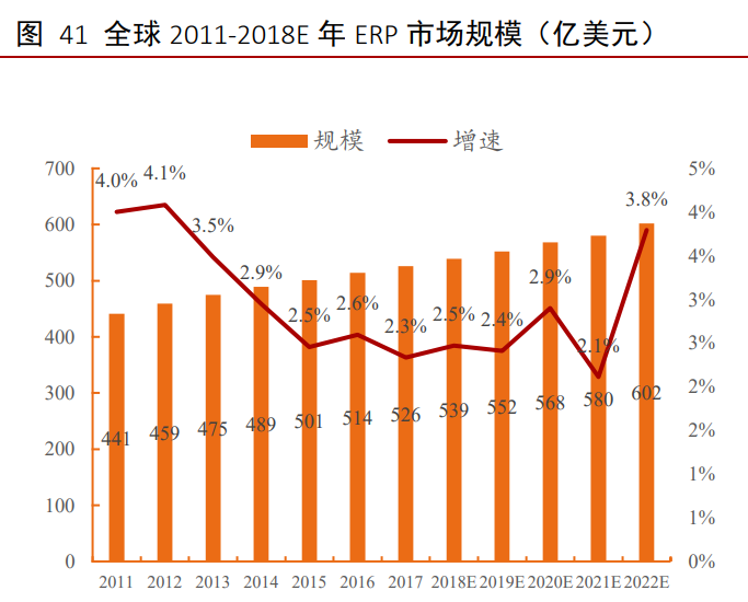 全球 ERP 增速稳定,电商 ERP 与 SAAS 化成为主要驱动力。根据 Forresters 数 据,2017 年全球 ERP 市场规模达 526 亿美元,年增速 2.5%,2014-2018 年以来增速均 稳定在 2.5%左右。分类型来看,全球 ERP 市场以传统型 ERP 软件为主,2017 年传统 ERP 市场规模为 305.6 亿美元,同比增长 1.0%;而在当今电子商务快速发展的背景下,全球电商 ERP 市场快速增长,2017 年全球电商 ERP 规模达到 192 亿美元,同比增长 3.4%。此外由于 SAAS 模式得到越来越多的认可,且电商作为新兴行业,对 SAAS 新业 务形态接受速度较快,电商 SAAS ERP 软件市场规模获得快速增长,2017 年电商 SAAS ERP 规模为 28.4 亿美元,同比增长 58.7%,远高于同期传统 ERP 市场增速,预计未来 随着全球电商产业的发展,电商 SAAS ERP 仍将保持较快增速。