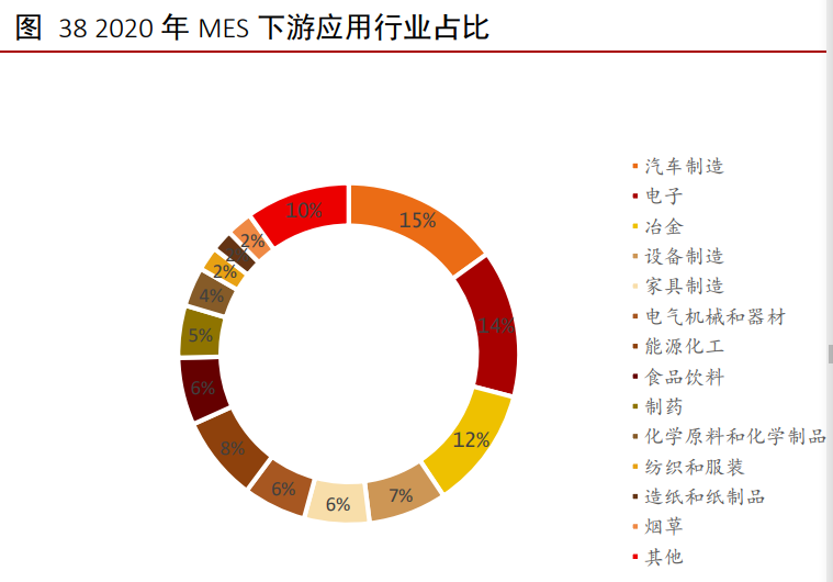 2020 年我国 MES 系统市场规模为 48.5 亿,同比去年增速为 18%,根据大东时代 智库预测,2021、2022 年市场规模增速高达 35%、45%。在行业应用上,MES 主要应用 于离散型行业,2020 年占比为 68.2%。从行业分类来看,2020 年占比最高的为汽车 15%, 其次为电子、冶金行业。目前 MES 产品制造业国产化率为 30%,国产替代空间广阔。 MES 产品因跨行业难度大,相关 MES 厂商多为特定行业的供应商,尚未出现跨行业、 跨区域的大型 MES 厂商,市场竞争格局较为分散。