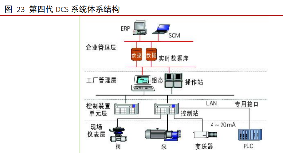 信息技术的发展以及用户对于管理需求的增加催生了新的 DCS 体系架构,第四代 DCS 系统主要分为四层:现场仪表层、控制装置单元层、工厂管理层、企业管理层。控制站主要包含现场控制站和数据采集站;工厂管理层中,操作站一般分为操作员站和工 程师站,对系统进行现场控制及应用运行监测等;企业管理层是第四代 DCS 系统的创 新,第三方软件 ERP 等通过实时数据库连接到 DCS 系统中,集成信息管理功能。