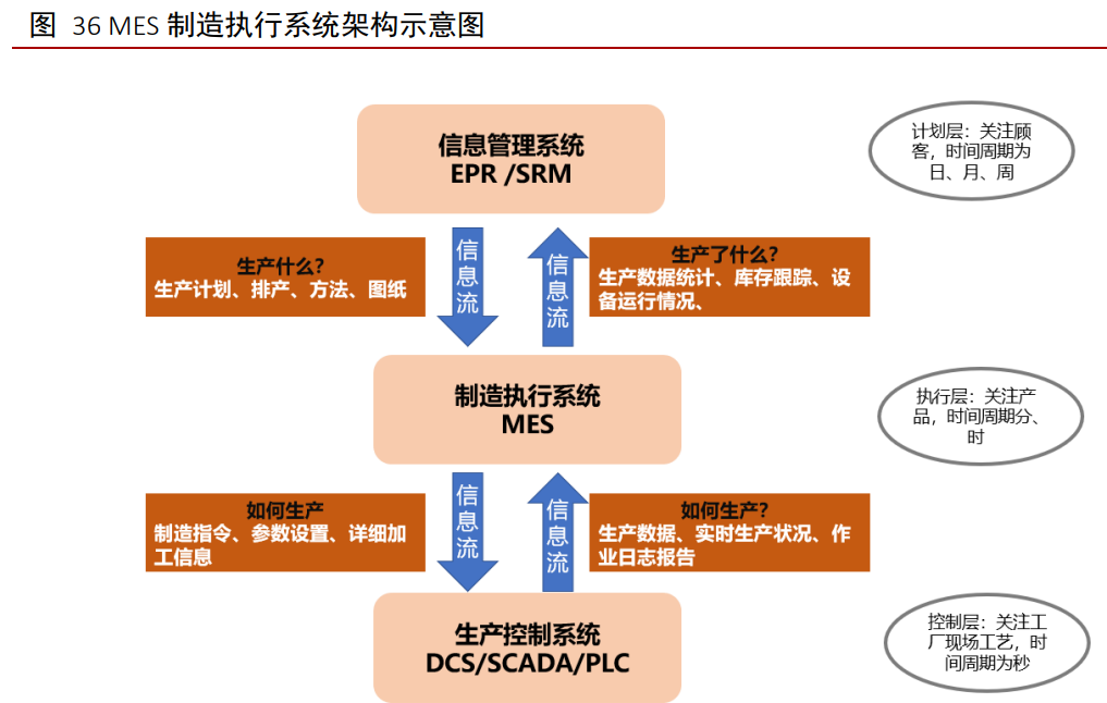 生产制造类软件主要分为两大层级,第一层级为生产控制类,主要有 DCS(分布 式控制系统)、SCADA(数据采集与监视控制系统)、PLC(可编程逻辑控制器)、EMS(能 源管理系统)等,侧重向下连接生产设备、传感器组件,负责采集数据、控制系统等;第二层级为制造执行软件,主要有 MES(制造执行系统),专注制造运营,是为一线工 厂运营层提供支持并落实公司管理层决策的系统。
