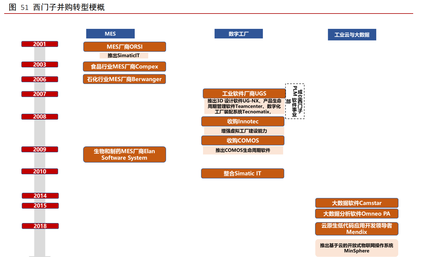 西门子软件收购经历了三大阶段,收购目标分别对应 MES、数字工厂、工业云与 大数据类厂商。进入新的阶段后收购的层次会更加丰富,与战略匹配,收购思路升级也 和工业软件的发展趋势相匹配。其中具有里程碑意义的是其 2018 年在 AWS 上发布的 MandSphere3.0 产品,该产品是其工业 4.0 时代标志性物联网平台。