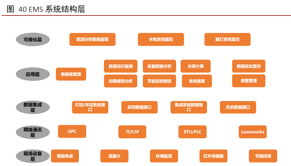 EMS(能源管理系统)用于企业能源供应、存储、输送和消耗的监控和管理,从而实 现能源预测、优化、节能减耗。能源管理系统可以帮助工业生产企业在扩大生产的同时, 合理计划和利用能源,降低单位产品能源消耗,提高经济效益,降低 CO2 排放量。按照 功能划分,EMS 系统可划分为 5 层,①现场设备层,用于获取底层数据;②网络通讯 层,用于传输网路信号;③数据集成层,用于实时采集数据、集成数据;④应用层的主 要功能有能源信息集成、能源信息分析、辅助分析等,将底层收集数据进行系统化应用; ⑤可视化层,主要将数据进行可视化分析。
