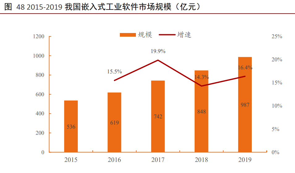 嵌入式工业软件在我国工业软件整体市场中占比最高,2018 年占比达 57.4%。近 年来随着智能化不断推进,嵌入式工业软件市场规模快速增长,近四年CAGR达16.5%, 2019 年市场规模达 987 亿元,未来随着我国智能制造的不断推进,嵌入式软件将持续保 持高速增长。