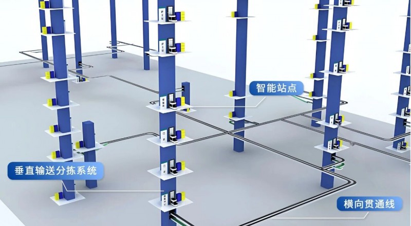 如下图所示,医院智能箱式物流系统主要由垂直输送分拣系统、横向贯通线、智能站点、控制系统和监控调度系统组成。物流系统的总效率,取决于垂直输送分拣系统效率和贯通线的效率。