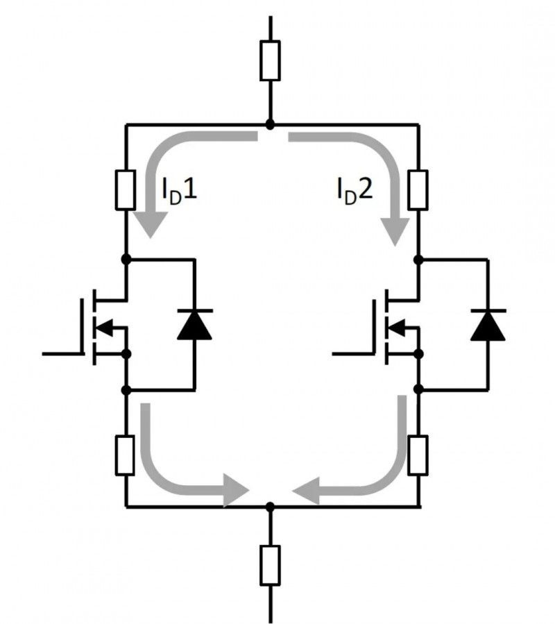 通态压降VDS(on)引起的稳态电流(di/dt≈0)不均衡如图1所示。为了减小这种电流不均衡,并联器件的VDS(on)应尽可能接近,例如采用同一批次或者特别挑选的器件。