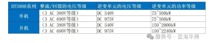 DTS800-R和DTS800-H分别是蓝海华腾公司开发的AFE整流/回馈模块和传动逆变模块。DTS800-R具有恒压模式、恒流模式和恒功率模式,正弦波的PWM整流/回馈,组成的AFE系统具有网测低电流谐波的特点。DTS800-H采⽤独⽴⾃主开发的DTC控制技术。具有快速的转矩响应性能和更⾼的稳速精度,可以实现有编码器或⽆编码器的DTC控制。独特的DTC控制技术,即使在⽆编码器下运⾏,仍然具有较⼤的低频转矩和较快的转矩响应特性。