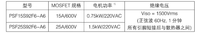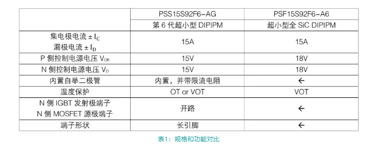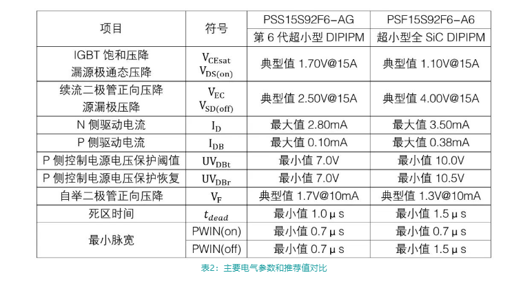 超小型全SiC DIPIPM(以PSF15S92F6-A6为例)与第6代超小型DIPIPM(DIPIPM Ver.6,PSS15S92F6-AG)主要电气参数对比见下表2。
