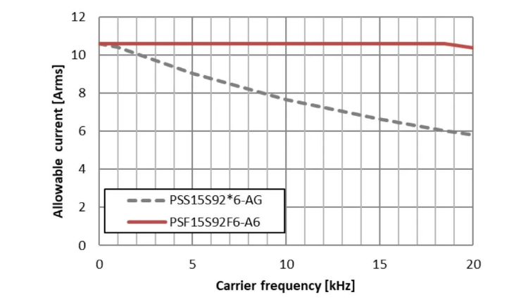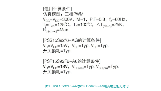 超小型全SiC DIPIPM的输出电流能力比第6代超小型的产品有了较大提高,给应用带来了极大的便利性。下图1是二者的电流输出能力仿真对比(以PSF15S92F6-A6与PSS15S92F6-AG为例)。