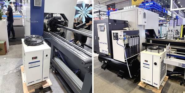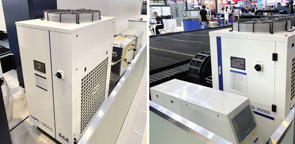 在多家参展商的高功率激光设备旁,特域CWFL系列双温冷水机默默发挥着关键作用。该系列产品最高可支持240kW激光设备的冷却需求,采用独创的双温双控技术,能够分别对激光器和激光头进行独立精准控温,有效隔离热源干扰,确保激光输出功率的稳定性和光束质量,实现一机多控,提升整机使用效率。