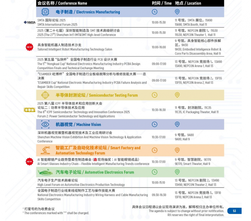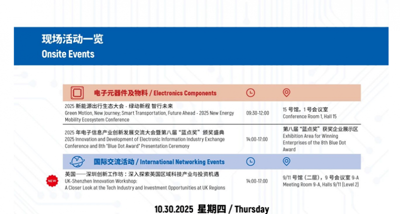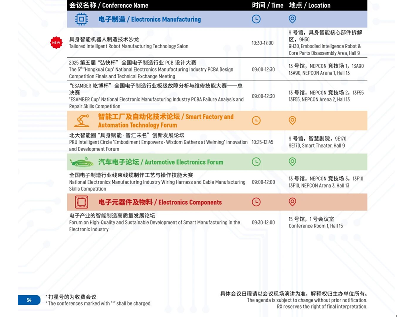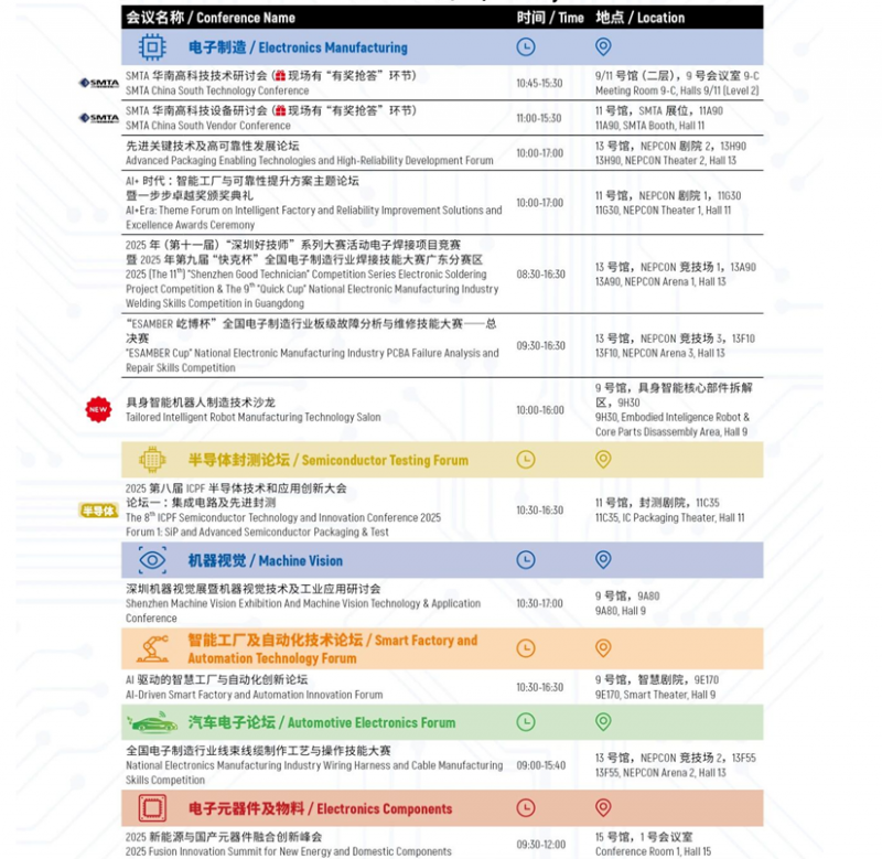 本届展会不仅打造具身智能机器人及核心零部件拆解区、AI智能眼镜拆解区、IGBT & SiC模块封测工艺示范线、电子成品自动化包装示范区、柔性生产制造及智能输送主题展区等亮点展区,还有40场会议活动覆盖七大模块,助力广大观众一站式看尽电子制造黑科技!