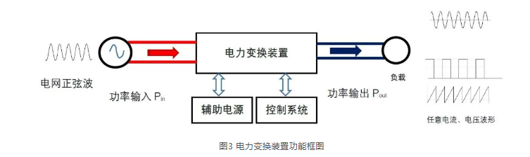 功率半导体器件是各种电力变换装置的核心,本质上它是一种电力开关,要求能够在低阻状态下流过从几安培到几千安培的电流,更能够在毫秒甚至微秒时间内对高达数千伏高电压、数千安培的大电流进行切断,通过多个功率半导体器件按照一定的拓扑结构进行组合,在CPU的控制下,就能把电力按照负载所需进行变换,其基本功能框图见图3所示。