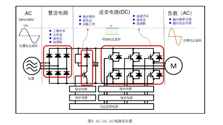 一般来说电力变换装置的功能有4种基本型式,即直-交(DC/AC)逆变模式、交-交(AC-AC)变频模式、交-直(AC-DC)整流模式和直-直(DC-DC)变换模式。图4是一种通用变频器常用的AC-DC-AC电路的拓扑结构,通过图4的电力转换装置,来自电网的固定频率、电压的电能被转换成了可以被负载利用的频率、电压可调的电能。在此电路中,整流桥工作在工频开关状态,需要承受大电流冲击;而用于刹车保护的IGBT与反向功率二极管工作在间歇模式,只有母线电压超过一定值时发挥作用,来防止母线过压;而逆变电路中的IGBT和反并联二极管则工作在高电压、大电流的高频开关模式,其损耗大,EMI*8噪声也高。