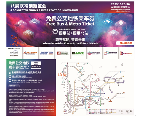 主办方在开展期间特别为前来展会的参展商和观众提供免费公交地铁乘车券,凭您的“2025亚洲工业科技展 ”任一展会的展商证或参观证领取,每人每天限领2张,当日领完为止。