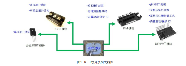 图1给出了由IGBT进化而来的各种相关功率器件的图片。由图1可以看出IGBT芯片是IGBT关联器件的核心,把IGBT芯片单体通过封装工艺制造出来的是IGBT分立器件;把多个IGBT芯片按照一定拓扑进行电气连接并进行封装就形成了IGBT模块。如果IGBT模块内部同时包含了驱动保护等相关电路,则称之为IPM或DIPIPMTM模块。就IGBT的芯片基本结构来说,IGBT芯片可以认为是MOSFET*7栅结构和双极型晶体管相结合而进化形成的混合型功率芯片。因此具有双极型晶体管和功率MOSFET的双重特点。
