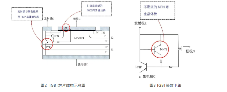 图2是典型IGBT芯片结构示意图,图3为其等效电路。IGBT与其它半导体元器件一样也是在硅、碳化硅、氮化镓等半导体材料上通过半导体工艺如外延、光刻、刻蚀、离子注入和扩散等工艺加工而成的一种多PN结半导体器件,因而也具有一般半导体器件所具有的特点,如存在耐压、耐电流、耐温要求;电气参数存在温度相关性以及寄生电感、寄生电容等寄生参数。同时IGBT芯片又可以看做达林顿结构MOSFET和晶体管组成的复合型芯片,又具有自身的特点,如门极采用MOSFET栅结构,电压驱动、驱动功率低、开关速度快,但栅极易受浪涌电压干扰、易发生过压损坏;工作电流大,导通压降低,但不允许长时间短路等。在实际应用中,需要特别留意寄生参数对IGBT工作带来的影响,相比其它主要参数如耐温、耐压、额定电流,寄生参数由于绝对数值低、难以测试评价等因素容易被忽略而导致IGBT在运行过程中发生故障。通常认为功率半导体器件为双稳态器件,工作状态主要是通态和阻态。但在实际应用过程中功率半导体器件却表现出更多方面的特性,除了通态和阻态外,还有开通、关断、触发、恢复、热和机械等特性。因此仅仅了解器件的通态、阻态远远不够,要充分发挥器件的性能,需要更好地了解器件的开通特性和关断特性及这些特性与器件寄生参数之间的关系。