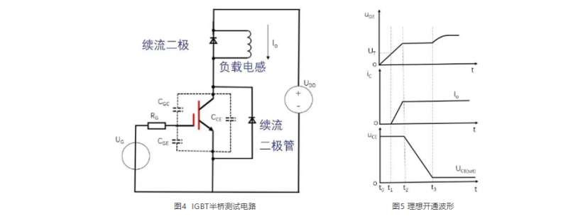 图4是IGBT半桥开关测试电路,采用电感作为开关测试的负载,可以用来对IGBT的开关进行评价。图4中虚线部分为IGBT的寄生电容,这些寄生电容对于IGBT的开关特性有直接影响。图5是IGBT的理想开通波形,栅极驱动电压UG在t0时刻通过栅极电阻RG加到IGBT栅极,UGE开始上升,向IGBT的栅射极电容CGE充电,当UGE上升到IGBT开启电压时,IGBT集电极电流Ic开始随着UGE上升而上升,同时续流二极管的电流开始下降,续流二极管电流和IGBT电流之和等于输出电流Io。在t1~t2期间,续流二极管的电流下降但仍处于正向偏置导通,这意味着直流母线电压仍然加在IGBT的C和E两端,IGBT输出电流是Io的一部分,这期间IGBT的功率损耗较大。从t2时刻起,负载电流全部由IGBT承担,此时二极管电流下降到零。