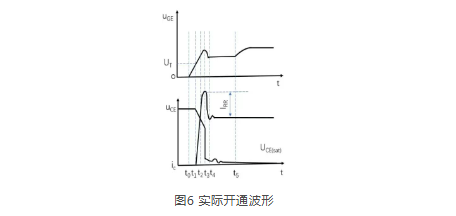 图6是IGBT的实际开通波形,考虑了二极管反向恢复和寄生电感的影响。当IGBT电流Ic在t1时刻开始上升时,寄生电感影响电流变化率,uCE下降引起寄生电容CGC(密勒电容)放电,该电流从栅极流向集电极,减少了向栅射极电容充电,从而使uGE上升率减少,导致集电极电流上升率减少。在t2时刻,二极管正向电流为零,负载电流在此过程中不发生改变,二极管反向恢复电流由IGBT承担,此时IGBT电流超过输出电流。在t3时刻,流过IGBT的电流等于输出电流Io和二极管反向恢复峰值电流IRR之和,二极管开始恢复反向阻断能力,反向恢复电流开始逐步减少。这一期间,IGBT和二极管都有能量损耗。t4时刻,由于寄生电感和寄生电容而引起振铃现象。在t4~t5期间,IGBT的集电极电压达到稳定状态。
