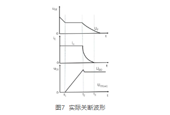 IGBT实际关断波形见图7,关断开始时栅极电压减少,栅射极电容CGE放电,t1时刻栅极电流恰好使IGBT进入临界饱和,输出电流Io全部由IGBT供给。t1时刻开始uCE开始缓慢上升。从t2时刻开始,当uCE增加到10V以后,密勒电容CGC的容量大大减小,明显减少了从集电极到栅极的反馈电流,uGE向零下降,uCE迅速向直流母线电压上升。t3时刻,IGBT集电极电压达到直流母线电压,输出电流转由续流二极管提供,完成关断过程。