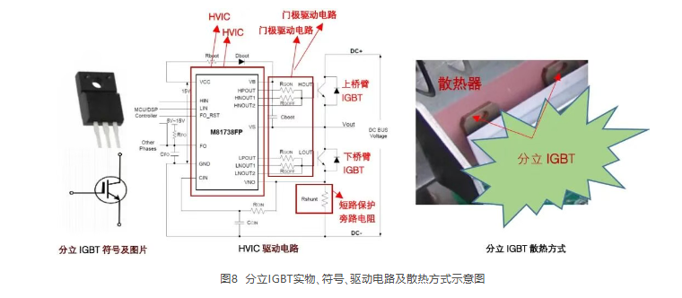 IGBT芯片的特性直接决定了IGBT器件的特性,同时又受到其它外围驱动参数的影响,对于分立IGBT的实际应用来说,驱动保护设计与散热设计是其中两个最重要的技术要点,对于器件的运行乃至电力变换装置的可靠性和寿命至关重要。由于IGBT门极采用了MOSFET栅结构,利用电压驱动,具有开关速度快、频率特性好的特点,另一方面电压驱动又使其门极易受到电压干扰,特别是器件本身的寄生参数或线路中寄生参数导致的浪涌电压都会对分立IGBT的运行产生影响。同时分立IGBT作为功率器件,工作时需要承受高压、大电流以尽可能提高电力转换功率,转换过程中功率损耗产生的热量需要及时的传递到外部,以保证IGBT芯片的结温不超过允许的上限,分立IGBT的散热设计也是IGBT应用过程中需要重点考虑的,散热设计涉及到IGBT的损耗计算、IGBT外部散热器设计、IGBT温度评估、IGBT温度保护等技术点。就驱动而言,分立IGBT经常采用高压集成电路HVIC*8来驱动。图8是分立IGBT的图片符号、驱动电路示意图及散热器结构。