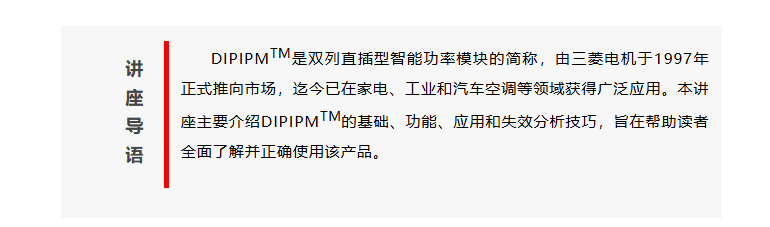 DIPIPMTM的发展可以追溯到上世纪90年代,并且随着小功率变频应用的发展而不断发展壮大,特别是在变频家电领域,更是占据了极高的市场份额。接下来的讲座中,将重点围绕DIPIPMTM的发展历史→结构特点→选型原则→电路设计→评价方法→健康管理→生产管理→应用技巧等方方面面展开详细讨论,敬请期待…