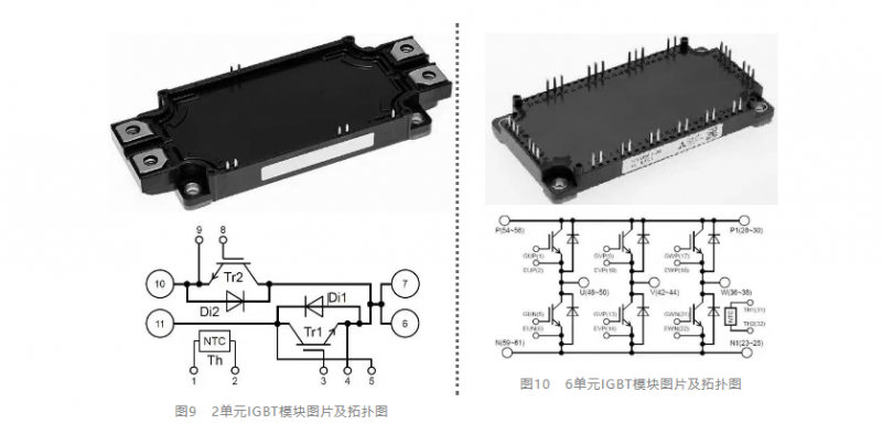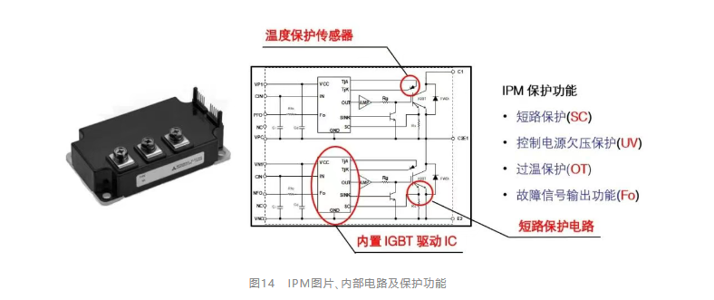 IPM模块内置驱动保护电路, 驱动电路的内置,使用户在应用时,不必再设计需要正负电源的IGBT驱动电路,也不需要设计短路电流检测电路、过温保护电路,这将大大简化PCB设计时间,同时对整个电力变换装置的评估时间也大大缩短,有助于用户迅速推出新产品。除了短路保护、过温保护功能外,IPM还具有控制电源欠压保护、故障信号输出功能,完善的保护功能,使采用了IPM的电力变换装置的可靠性得到大幅提高。特别是对性能、可靠性要求高的领域,如电梯变频器、UPS电源、伺服控制器等都在广泛应用IPM。在散热设计上,IPM的内部IGBT单元可以共用同一散热器,并且内置IGBT芯片温度传感器,可以对6个IGBT芯片的温度进行实时监控,在发生过温时及时关闭IGBT并给出故障信号,从而使IPM在热设计方面比IGBT模块更可靠。IPM可靠性提高付出的代价是设计制造相对复杂,成本较高,图15是一种6单元IPM内部结构图。