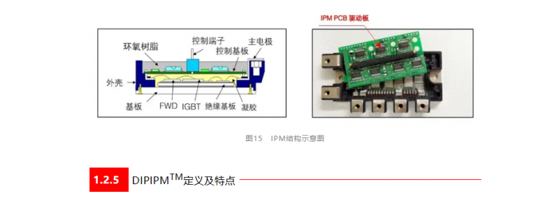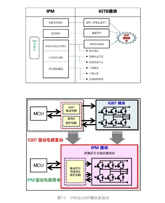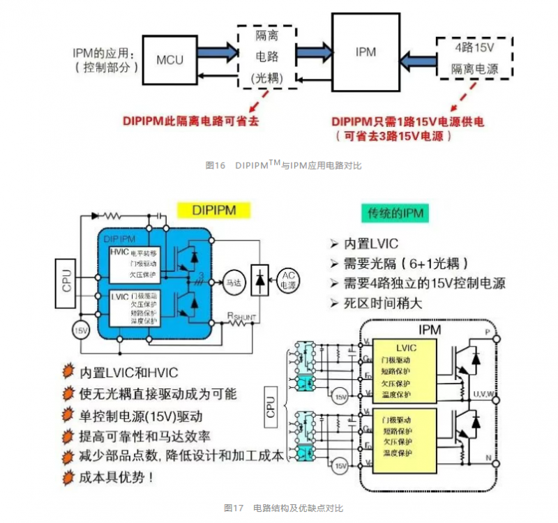 在第一讲中,我们了解了功率器件的分类及其发展的历史,在本讲中重点介绍了IGBT及IPM的概念、应用要点、分立IGBT→IGBT模块→IPM的进化过程。以上这些功率半导体器件基础知识的介绍,是为了更好地理解后面讲座中重点介绍的产品DIPIPMTM及其应用,DIPIPMTM是双列直插智能功率模块的英文缩写,可以说DIPIPMTM是一种小型化的IPM。它采用了压注模封装,内置了HVIC,外围电路变得更加简单而节约成本,与IPM相比拥有许多自己的特点,下图16给出了DIPIPMTM与IPM应用电路对比,对于DIPIPMTM其内置了HVIC,应用电路中不再需要光耦进行隔离,采用自举电路,只需要单路15V控制电源即可。图17给出了DIPIPMTM与IPM内部电路结构及优缺点对比,相比IPM,DIPIPMTM更易于设计使用,成本更低,特别适合大批量制造及应用。