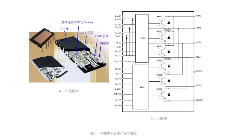 功率半导体器件进化和发展的动力源自于人类对于电气设备及其电力变换装置的高性能、低成本、易使用等要素的不懈追求。具体到DIPIPM™*1,则与变频空调的诞生和发展密切相关。早在1980年变频技术首先被应用到空调上,这是空调发展史上一个重要的里程碑。相对于传统的定速电机方式,变频方式通过PWM*2调制波来控制功率器件的开通和关断,进而控制加在电机上的电压来实现对电机转速的控制,从而实现了制冷和制热(温度)的自由调节。变频方式不但能带来更好的舒适性,同时也带来了节能省电的优点。这一时期变频空调控制器采用的主要是分立器件或IPM*3方案。之后在1993年,日本开始实施变频空调节能法,日本空调厂商展开了节能空调产品的激烈竞争,这不但提升了空调的节能性能,也促进了变频空调的普及化。同时也对功率模块在节能、小型化等方面提出了更新的要求。空调行业的发展趋势要求功率模块不仅需要提高内置功率器件的效率,减小产品的封装尺寸,而且要在保证高度安全可靠的同时实现产品的低价格。这对功率模块的内置芯片工艺、封装工艺以及内置功能提出了非常高的要求。由于变频空调控制器的分立方案太过复杂,而传统IPM方案成本太高,为了解决这个问题,三菱电机创新性地推出了双列直插型智能功率模块DIPIPM™,并在1997年开始了批量生产。DIPIPM™内置了高耐压驱动芯片,不但可以实现单电源IGBT*4驱动,使高开关速度成为了可能,提高了功率模块的效率,而且集成了欠压、过温、过流等保护功能,大大降低了空调变频控制器的设计难度,大幅度地减小了空调变频控制器的体积,同时也进一步提高了变频空调的可靠性。图1给出了三菱电机双列直插型智能功率模块(DIPIPM™)产品内部结构及电气原理图。由图1可以看出,相比较传统的IPM,DIPIPM™采用了压注模封装工艺,成本更低、生产效率更高;内置了HVIC、LVIC驱动芯片,PWM驱动信号可以不通过光耦而直接连接到MCU输出端口;上桥臂电路采用自举方式供电,只需要单路15V电源即可。