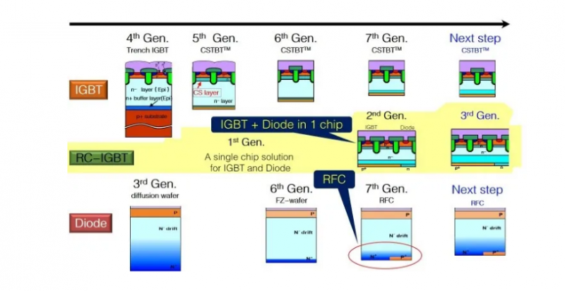 三菱电机从把DIPIPM™推向市场开始,为满足变频空调等家电设备对功率元器件特性要求的不断提高(功耗,成本,体积等),对DIPIPM™的内置IGBT芯片以及封装技术进行不断改进。首先是IGBT芯片技术的变迁,IGBT芯片是DIPIPM™最重要的功率元器件,从早期三代的平面型IGBT,到第四代沟槽型IGBT,三菱电机一直在IGBT芯片的半导体结构和生产工艺上不断地进行创新,芯片面积、工艺线宽、通态饱和压降、关断时间、功率损耗等各项指标经历了不断的优化,性能也得到稳步提升。图2展示了三菱电机IGBT芯片技术的发展路线。