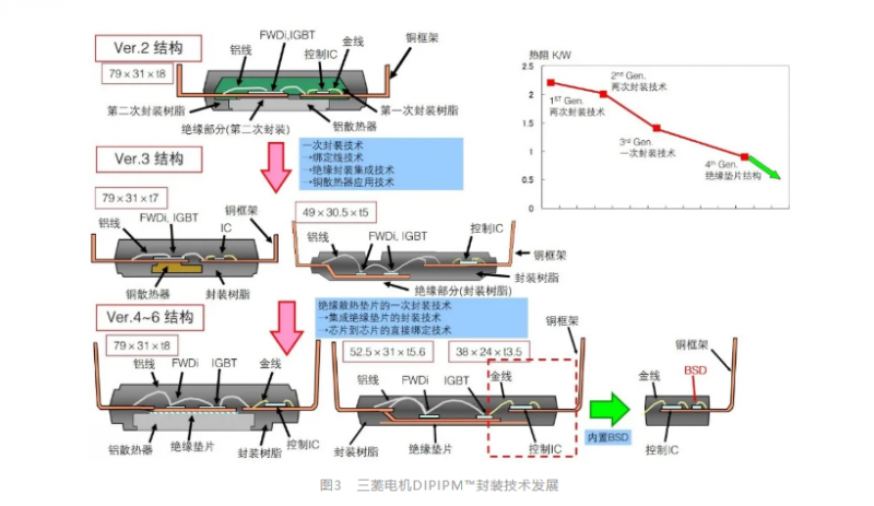 封装技术直接影响着功率器件的整体性能和可靠性,与对芯片技术的不断探索一样,三菱电机对改善封装技术孜孜以求,臻于至善。DIPIPM™的封装技术不断取得进步,在做到产品成本越来越低、生产效率越来越高的同时,DIPIPM™的性能表现稳步提高。同时也通过材料的节省以及包装材料的减少间接达到了减少资源消耗、节能和环保的目的。图3展示的是三菱电机DIPIPM™模块封装技术的发展。