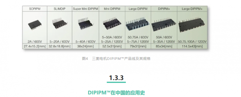 自从1997年第1代DIPIPM™诞生以来,伴随着IGBT芯片一代一代技术的发展和封装技术的不断改进,三菱电机也对DIPIPM™产品不断进行升级换代,至今已发展至第7代DIPIPM™,封装形式也从大型发展到小型、超小型、SLIMDIP™乃至SOPIPM™和DIPIPM+™,不断致力于为客户提供更高能效、更高集成度、更完善智能化、更高功率密度、更高性价比的产品。目前三菱电机DIPIPM™家族旗下拥有七大系列产品:SOPIPM™、SLIMDIP™、Super mini、Mini、Large、DIPIPM+™和Large DIPIPM+™,如图4所示。客户可以根据实际需求选择最合适、性价比最高的产品。