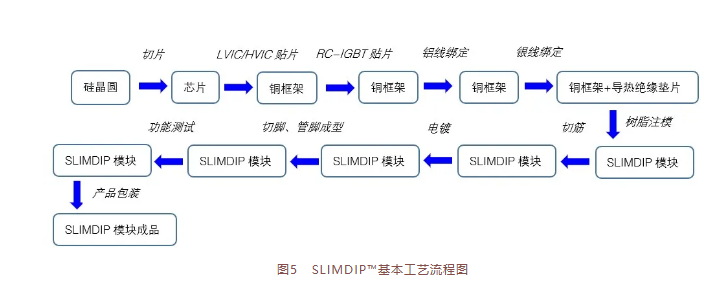 由图3可以看出,SLIMDIP™的引脚采用了双列直插式引脚作为与PCB线路板的电气连接;整体封装则采用了树脂材料通过压注模工艺来实现。其内部结构主要包含了注模树脂、铜框架、RC-IGBT芯片、IC芯片、自举二极管芯片、铝绑定线、银绑定线等部分。其中铜框架、RC-IGBT芯片、IC芯片、自举二极管芯片、铝绑定线、银绑定线为电气部分,为电流提供通路;绝缘导热垫片与散热铜箔作为机械结构为功率芯片提供绝缘和热的传导路径;注模树脂为电气部分提供足够的机械支撑、电气绝缘和环境防护。针对DIPIPM™这种双列直插智能功率模块的结构,需要相应的封装工艺来支持。以SLIMDIP™为例,在晶圆生产完成后,其芯片的性能已经被确定下来,之后被转移到封装工厂进行产品封装。尽管封装工艺对SLIMDIP™芯片性能没有直接影响,但会对整个SLIMDIP™模块的可靠性、热性能、机械性能带来影响,下图5是SLIMDIP™基本封装工艺流程图。