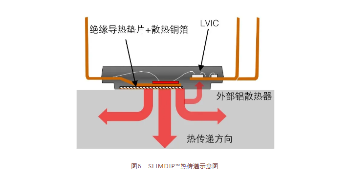 图5的工艺中,贴片工艺是为了将HVIC/LVIC及RC-IGBT芯片焊接到铜框架上,如果焊接工艺出现偏差,会导致芯片与铜框架的焊接出现分层,从而降低SLIMDIP™可靠性和寿命。铝线用来连接功率芯片和模块引脚,为主电流提供通路。树脂注模是SLIMDIP™封装过程中最为重要的工序,压注成型的好坏直接决定SLIMDIP™是否具有良好的耐受恶劣环境的能力,决定了模块的主要机械特性,如模块的安装强度、散热性能、平整度、绝缘性能等。绝缘导热垫片是SLIMDIP™用来传导热量和为内部电路提供电气绝缘的重要部件,直接决定了模块的热性能。图6给出了SLIMDIP™的内部热传递的示意图。由图中可以看出绝缘导热垫片起到了隔离带电的铜框架和外部铝散热器的作用,并且为热的传导提供了低热阻通路。