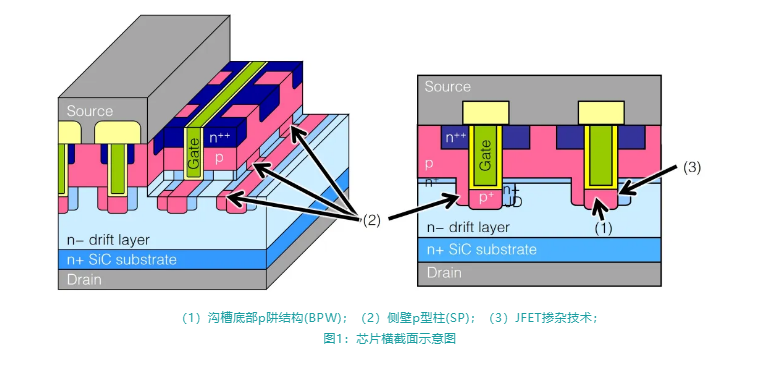 J3系列碳化硅模块采用三菱电机最新一代沟槽栅SiC MOSFET芯片,如图1所示,该芯片采用了沟槽底部p阱结构,侧壁p型柱结构和JFET掺杂技术,在确保栅极可靠性的同时实现了低通态电阻,低开关损耗和高栅极阈值电压。与平面栅相比,通态电阻降低了50%以上。由于栅极阈值电压高,即使有噪音,也很难发生误导通,高温下也可以实现安全稳定运行。