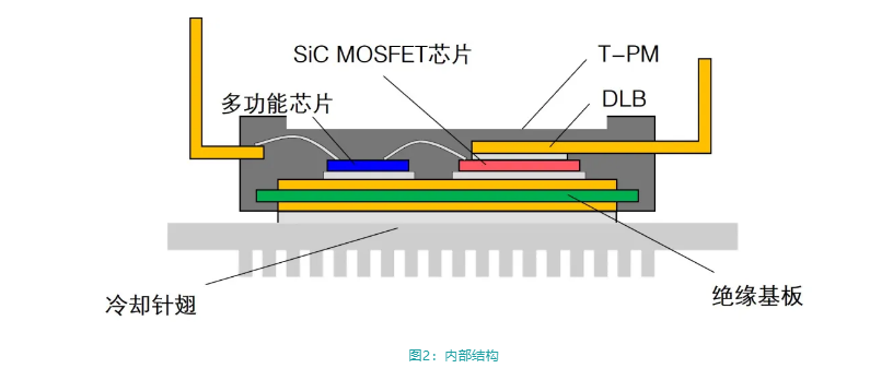 J3系列SiC模块采用压注模封装工艺(硬树脂),如图2内部结构所示,既增加了抗震性,又提高了生产效率。功率芯片和绝缘基板的连接采用了银烧结技术,更可靠,热阻更低。主端子采用直接端子绑定(DLB)技术,使芯片表面温度分布更均匀,提高了功率循环寿命。