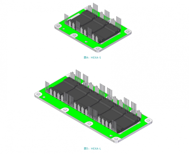 J3 T-PM支持并联使用,可组成多样化产品阵容:HEXA-S和HEXA-L。图4为HEXA-S,尺寸(包括针翅底板)为111mm×87mm。图5为HEXA-L,尺寸(包括针翅底板)为193mm×87mm,有助于客户缩小逆变器体积。
